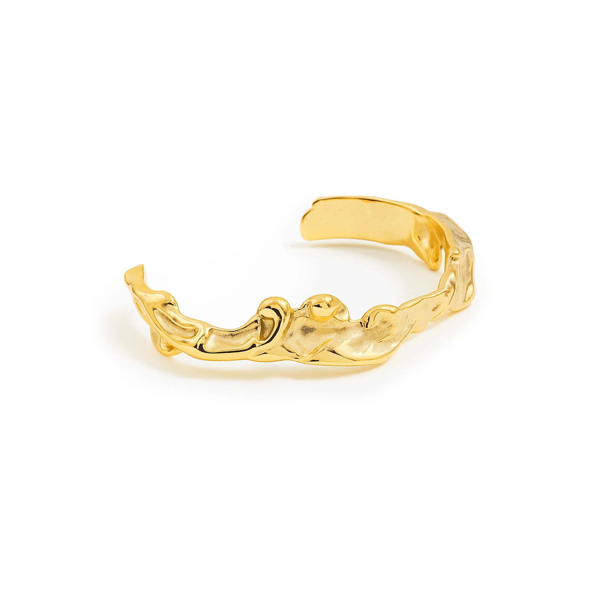 A molten-texture open cuff with an organic, fluid form. The uneven surface reflects light in unexpected ways, creating a rich visual texture. Designed to mimic the look of flowing metal, this cuff is sculptural yet wearable.
